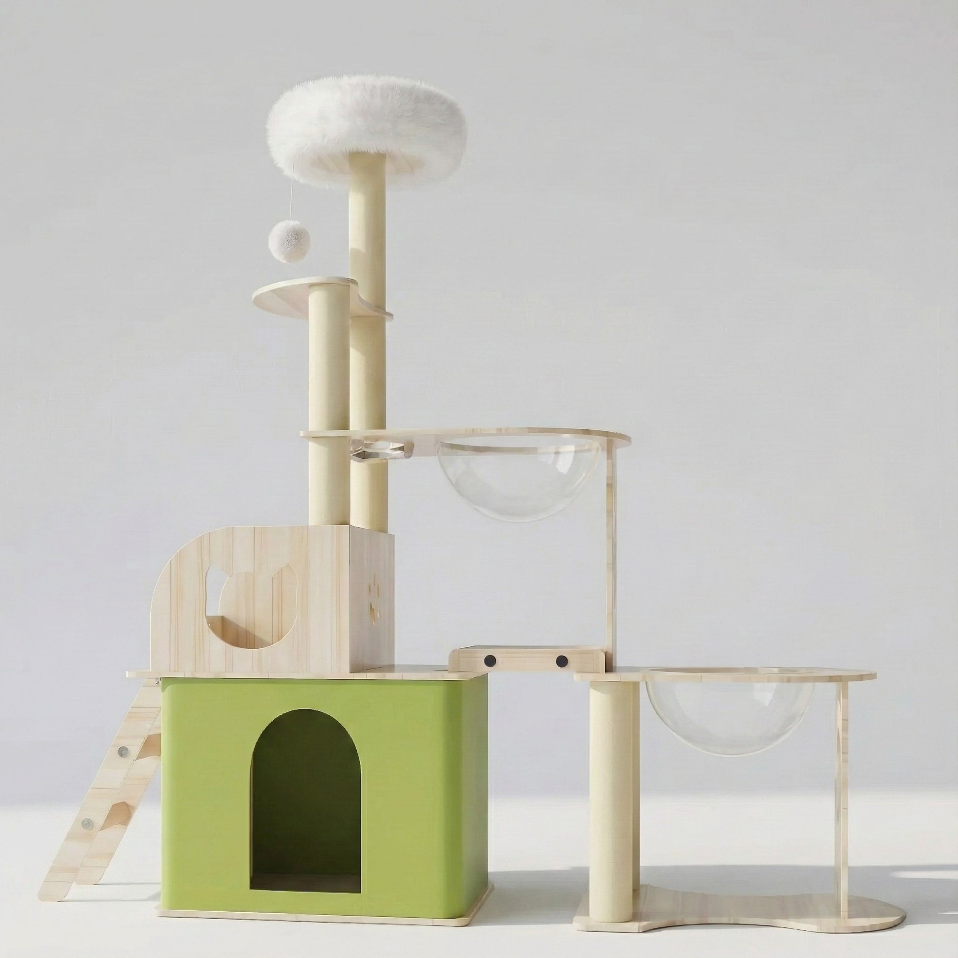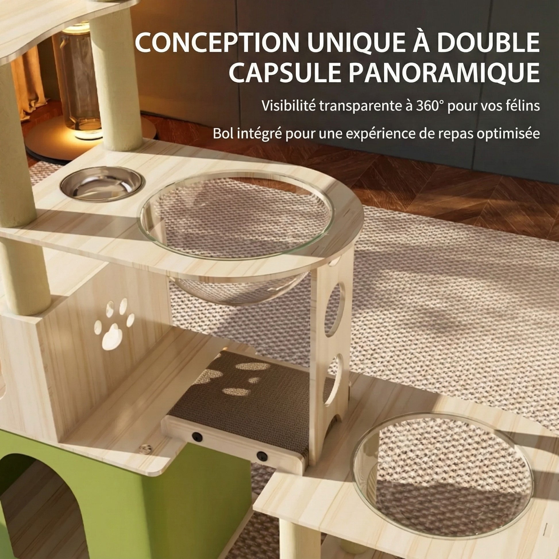 • Matériaux : Bois d'ingénierie (Structure), Acrylique (Capsule), Sisal naturel (Griffoirs), Tissu peluche (Coussins).