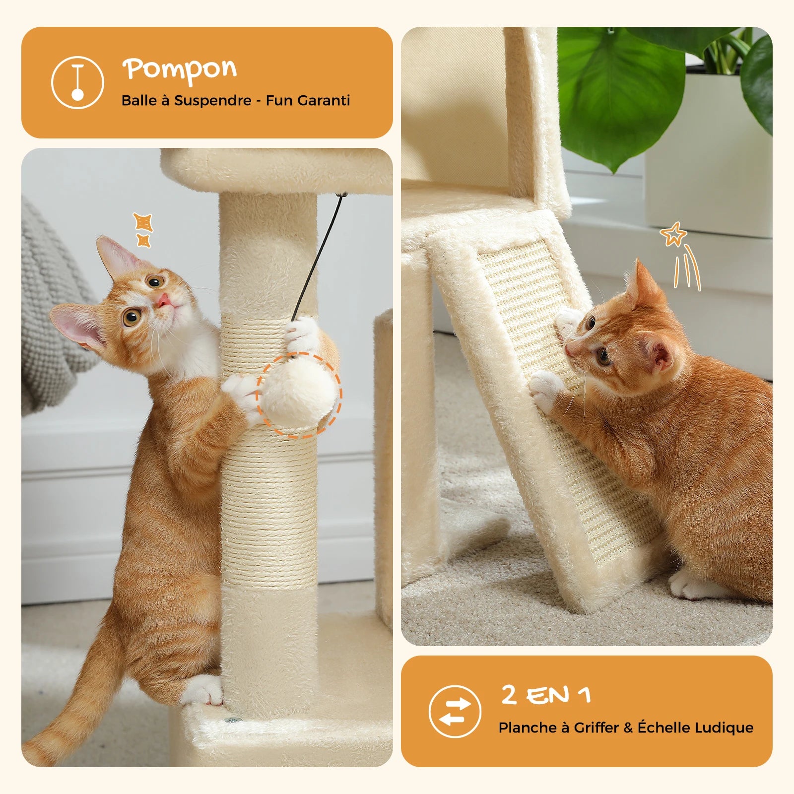 • Accessibilité : Une rampe griffoir inclinée permet un accès facile au premier niveau, préservant les articulations des chats âgés ou des tout-petits.