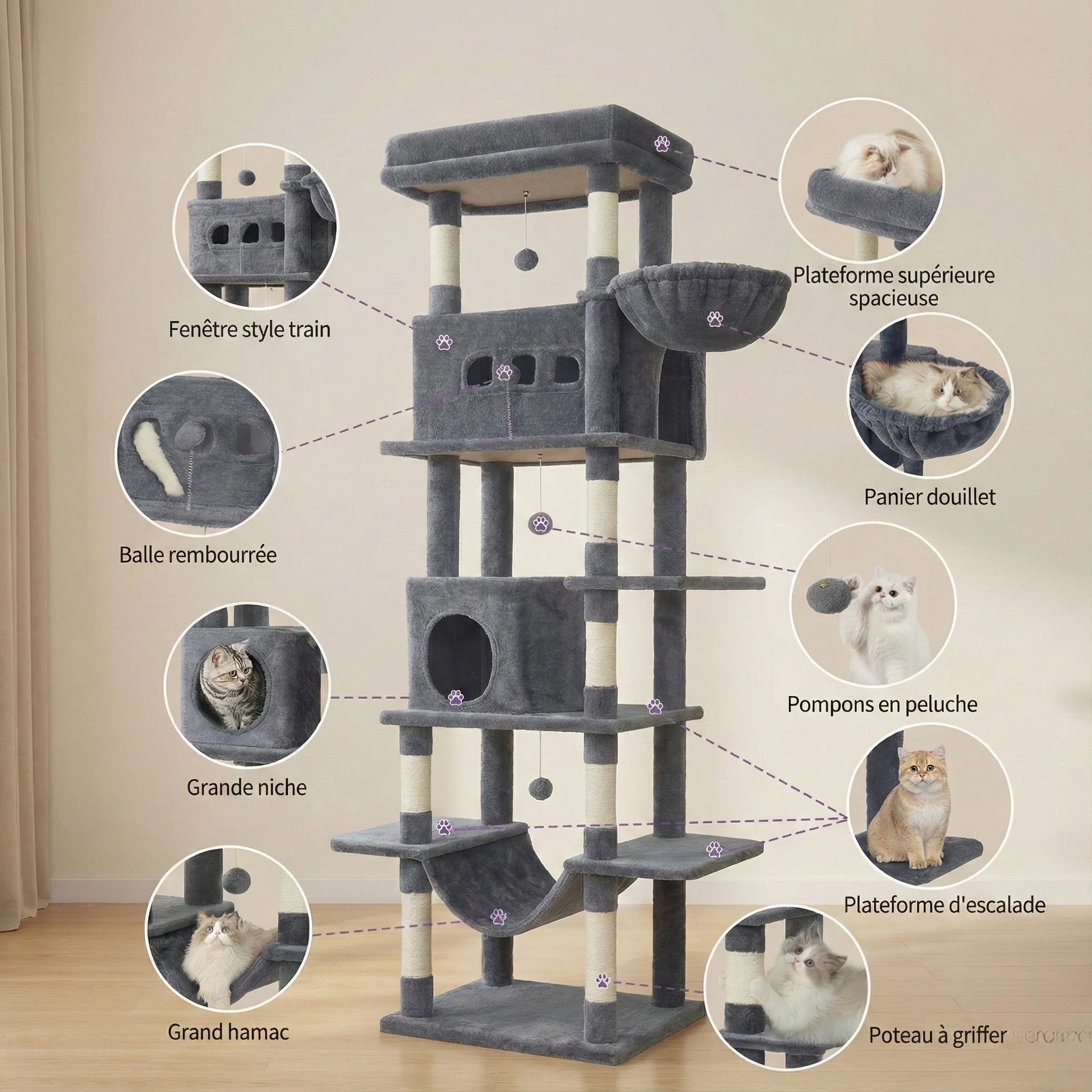 • 8 Poteaux à Griffer : Répartis sur tous les niveaux pour sauver votre canapé.
