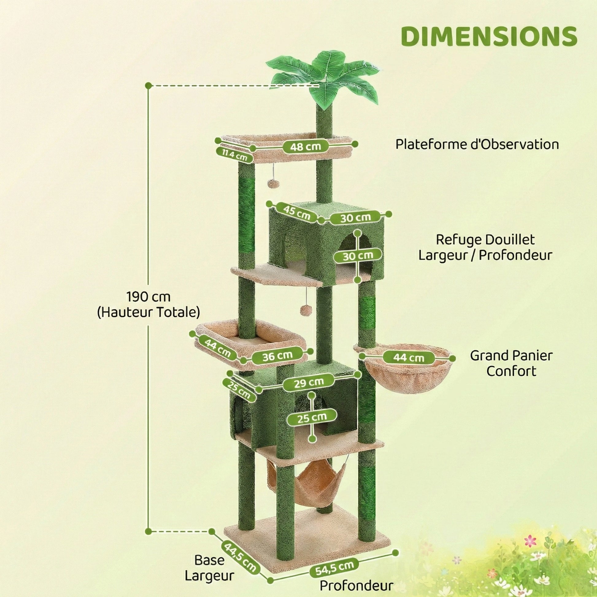 Hauteur Totale : 190 cm (Format Gratte-Ciel). Emprise au Sol : 60 cm x 50 cm (Base rectangulaire densifiée). Poids du Produit : 17,5 kg. Matériaux : Panneaux composites certifiés, Revêtement Peluche Haute Densité (Gris/Vert), Sisal Naturel (4mm). Capacité d'Accueil : Idéal pour 3 à 4 chats de gabarit standard ou grand.