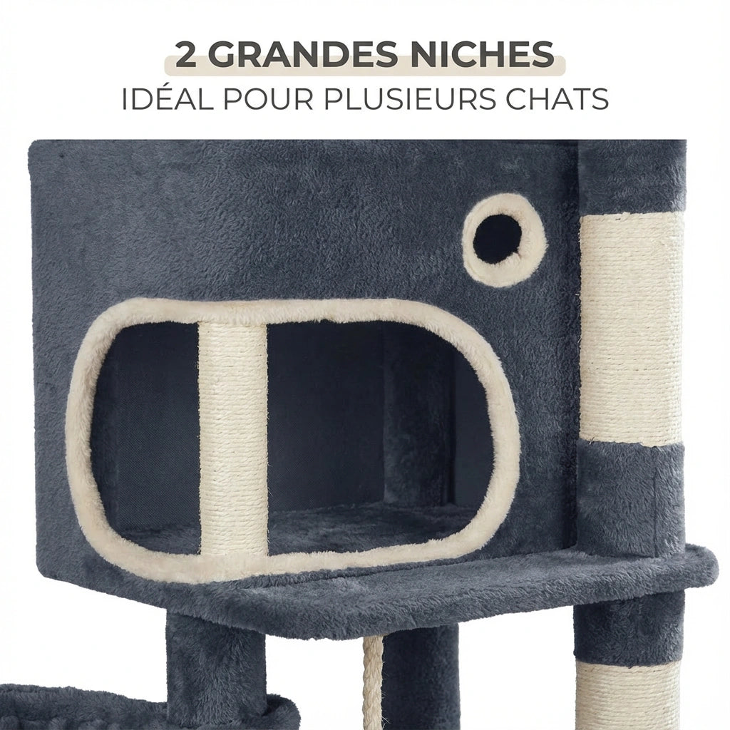 Hauteur Totale : 169 cm (Format XXL). Emprise au Sol : 60 cm x 40 cm (Base rectangulaire stable). Poids du Produit : 14,5 kg (Structure densifiée). Matériaux : Panneaux de particules (Structure interne), Revêtement Peluche Douce (Gris ou Beige), Sisal Naturel (4mm). Équipements Inclus : 2 Niches, 3 Perchoirs hauts, 1 Corde de jeu, 2 Pompons suspendus, Kit anti-basculement.