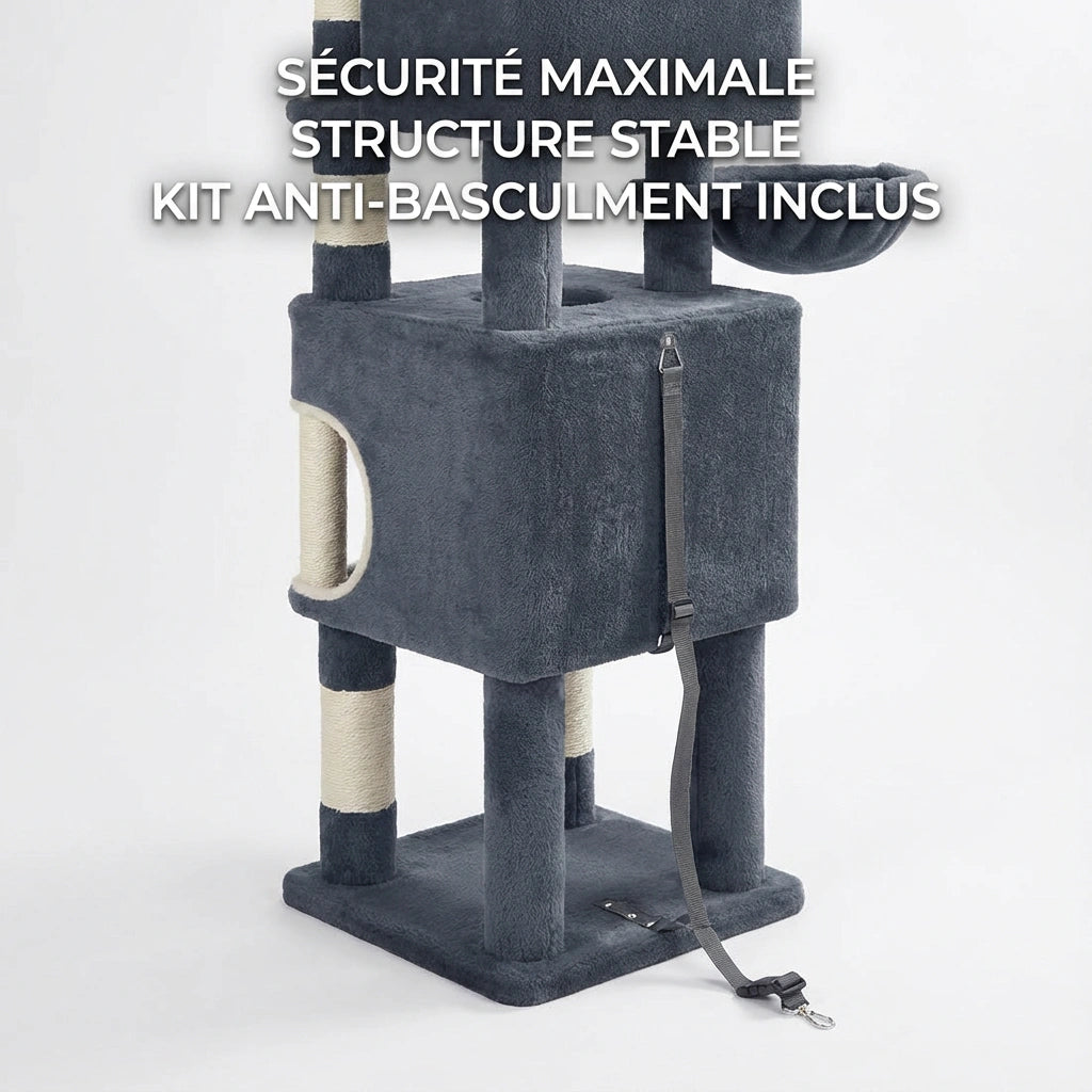 La stabilité est le critère de sélection n°1. Les modèles XXL et hauts disposent d'une base élargie. Pour une sécurité absolue, notamment si le chat saute avec beaucoup d'élan, il est impératif d'utiliser le kit anti-basculement (sangle discrète) fourni pour fixer l'arbre au mur. C'est la seule garantie physique à 100% contre le renversement.