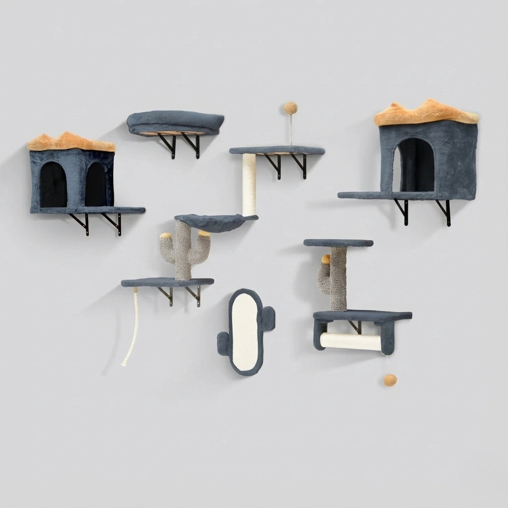 Ce système modulaire mural de 7 pièces est la solution idéale pour offrir un terrain de jeu vertical à votre chat sans encombrer le sol. Il se distingue par son design bicolore contemporain (Gris Anthracite & Jaune Moutarde) et ses clins d'œil esthétiques en forme de cactus.