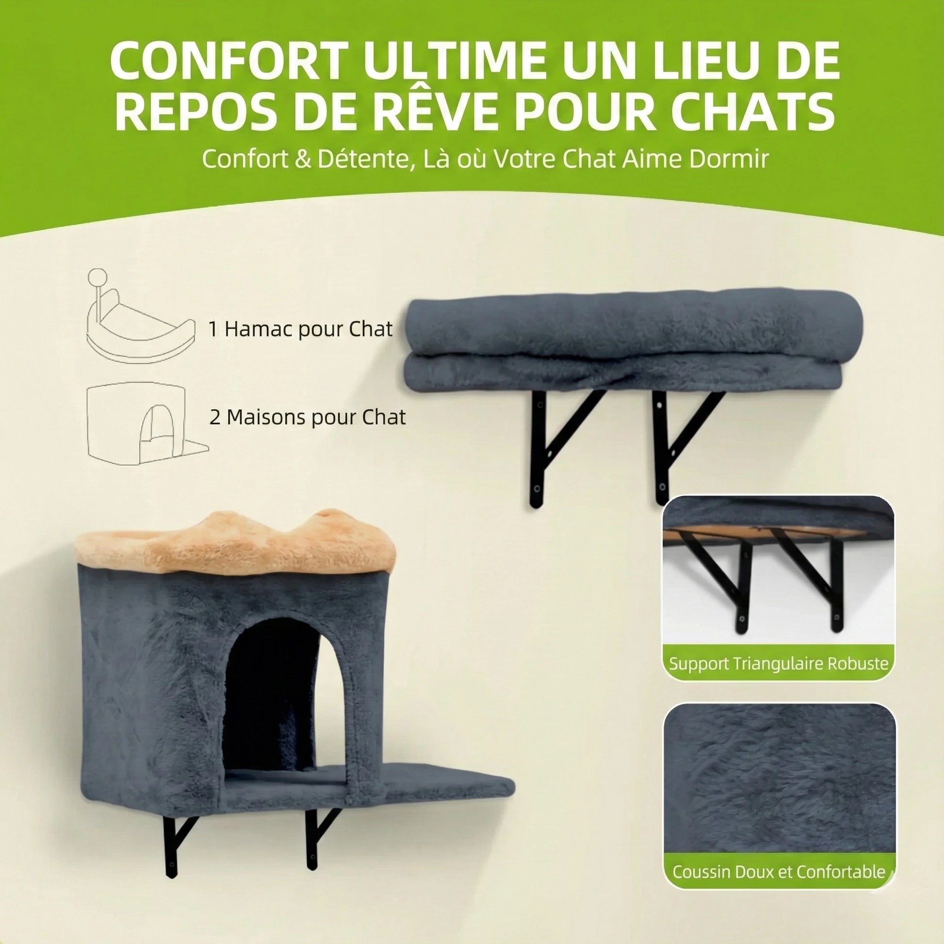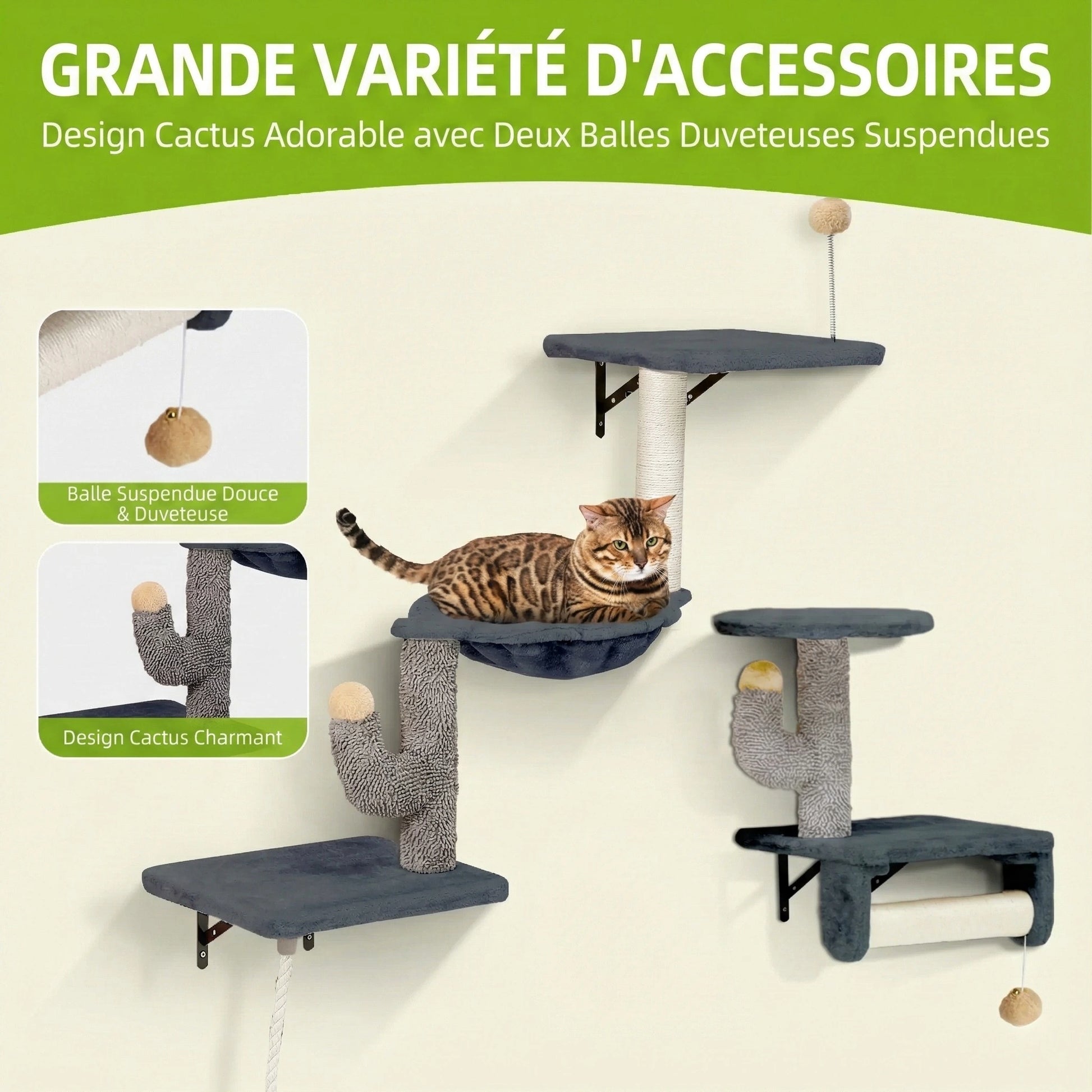 • Composition du Kit (7 Pièces) : 1 Niche Condo, 1 Hamac, 4 Plateformes/Marches, 1 Griffoir Cactus.